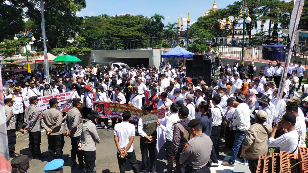Massa mendesak agar Bupati, Wakil Bupati, Ketua DPRD, serta pejabat terkait menemui mereka dan memberikan keputusan konkret.